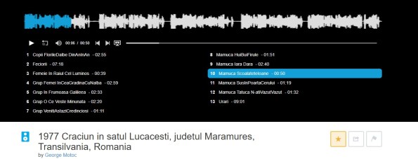 Nu am mai ascultat cantecul asta de 42 de ani. Atunci, o seară de Craciun la Lucăcești, satul minunat al mamei din Țara Chioarului. Mămuca, bunica, l-a cantat pentru noi, si din fericire a existat un reportofon pe-aproape (nr. 10 pe lista):