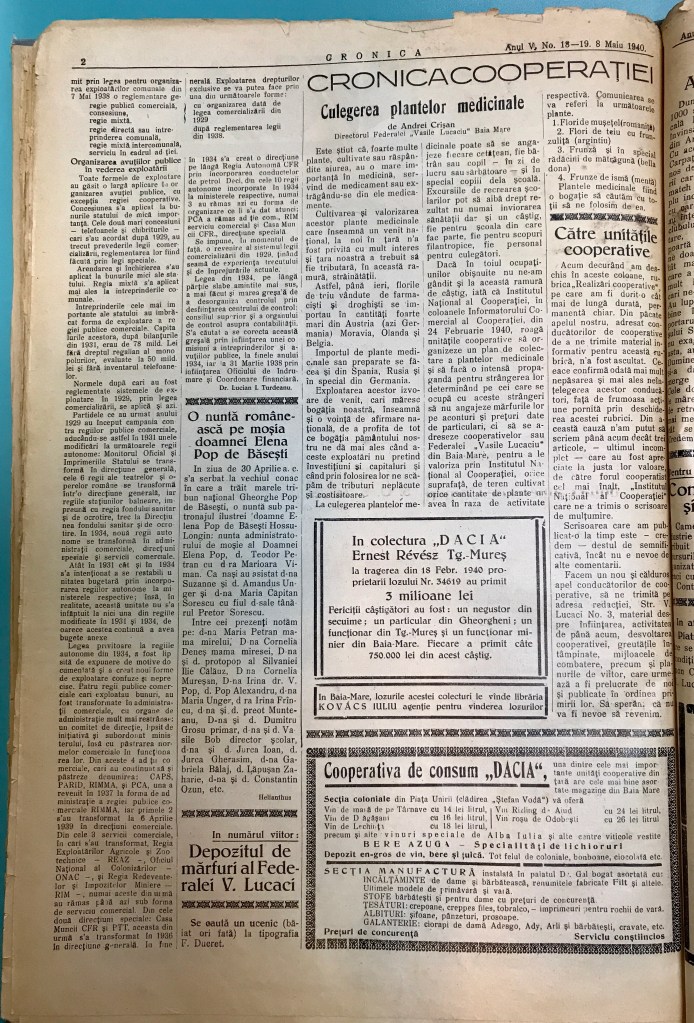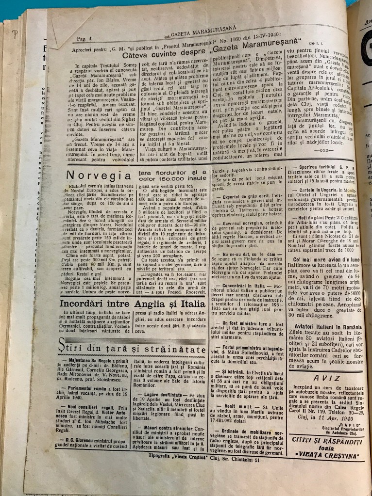 Am fotografiat aceste fascinante pagini de acum 80 de ani într-una din sălile primitoare ale Bibliotecii Județene Maramureș din Baia Mare. Lăudabil, colecțiile sunt disponibile oricărui abonat (un abonament se poate face pe loc). Regretabil, în ultimii 30 de ani nu s-a digitalizat nici măcar o pagină din ziarele tipărite în Maramureș și Baia Mare; am putea invita lumea întreagă, de la cercetători la pasionații de istorie, să ne cunoască. Până atunci, rămânem cu plăcerea hârtiei la sala de lectură, atunci când suntem în Baia Mare.