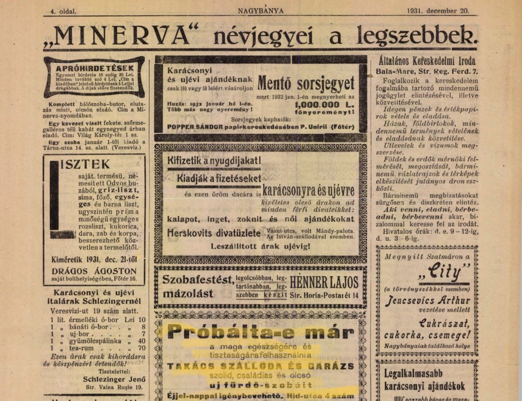 O reclamă la hotelul Takacs de pe strada Podul Viilor – o alternativă mai ieftină celebrului Ștefan Vodă din centrul cetății – în preajma crăciunului 1931, în ziarul local de limba maghiară din Baia Mare.