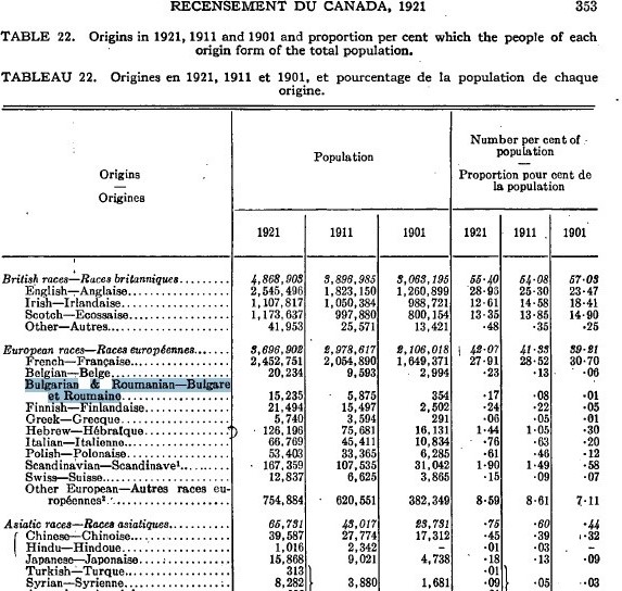 In the 1921 national census , Romanians were counted with Bulgarians as one of the European races and totaled a mere 15,235 population (0.17% of Canada). Despite those small numbers, they were notably present to greet their Queen during her stops in Hamilton, Toronto and Montreal.
