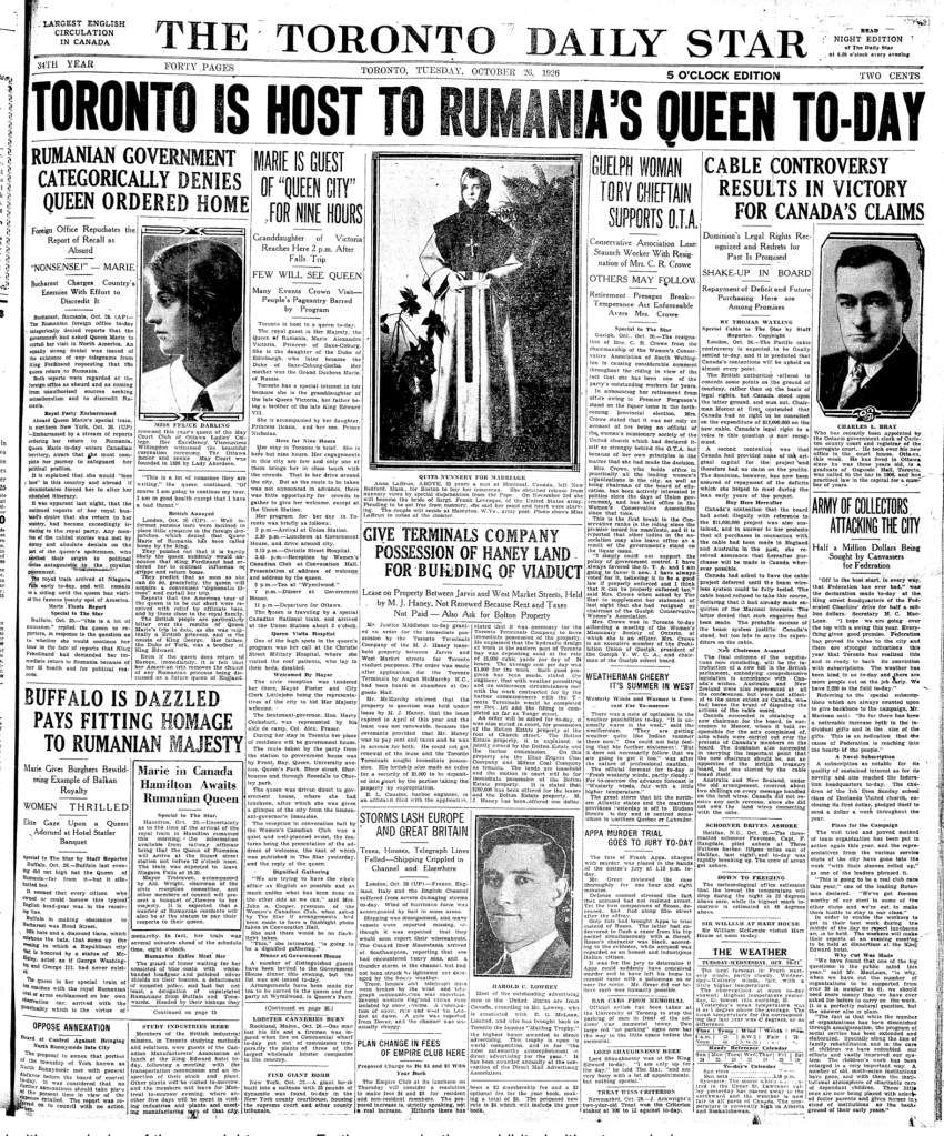 The 5 o’clock edition of The Star on the day of the visit, with various reports from Queen Marie’s visit to Buffalo the night before and first impressions from her arrival in Toronto