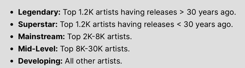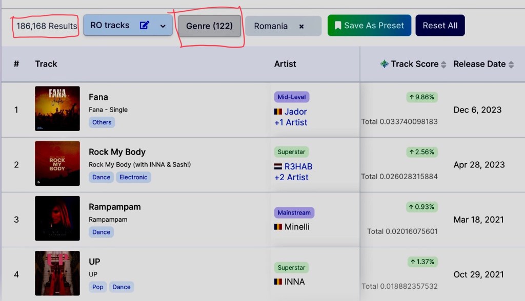 Of the 6 main Career-Stage pools in Chartmetric, Romania has no Legenday artist listed, one Superstar (INNA) == 28 Mainstream == 84 Mid-Level == 804 Developing – the remaining 7,148 being Undiscovered
