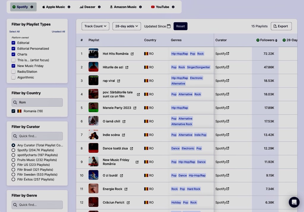 Spotify has 15 editorial playlists dedicated to Romania. None has more than 100k followers.