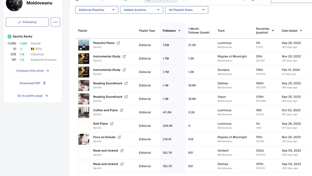 With a modest catalog of just 18 tracks, all released after 2020 and averaging around 2 minutes and 30 seconds each, Moldoveanu boasts an impressive 988,242 monthly listeners on Spotify alone. Despite having a relatively small following of 1.18k on the platform, his massive listener base is primarily attributed to inclusion in editorial playlists. This phenomenon raises the question: Is Moldoveanu truly successful?