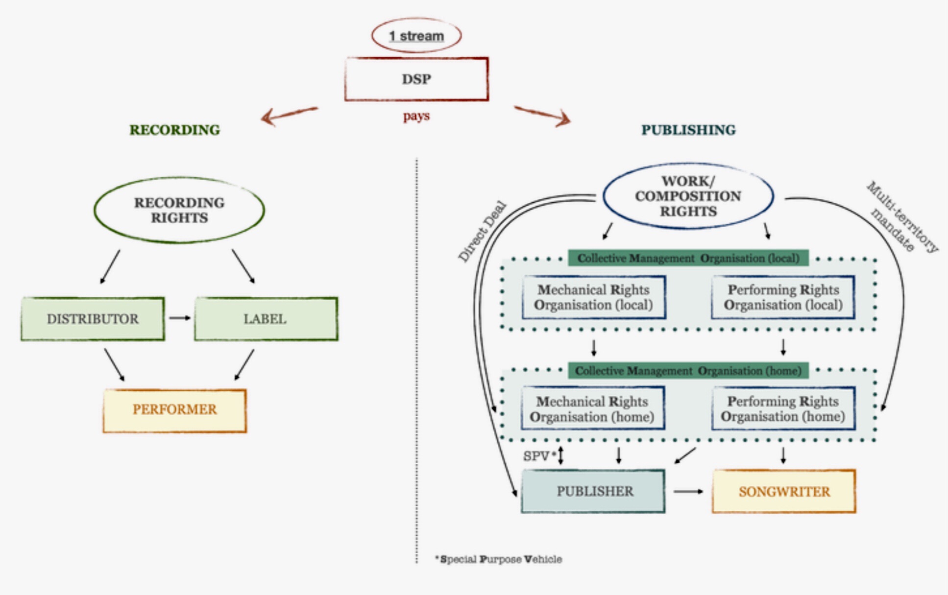 În lege, drepturile muzicale se împart în două categorii: cele de autor, legate de compoziție și versuri (administrate de exemplu de UCMR-ADA); și cele ale variantei înregistrate.