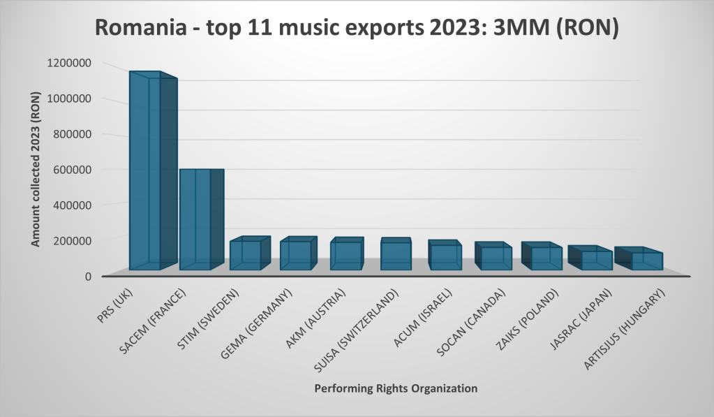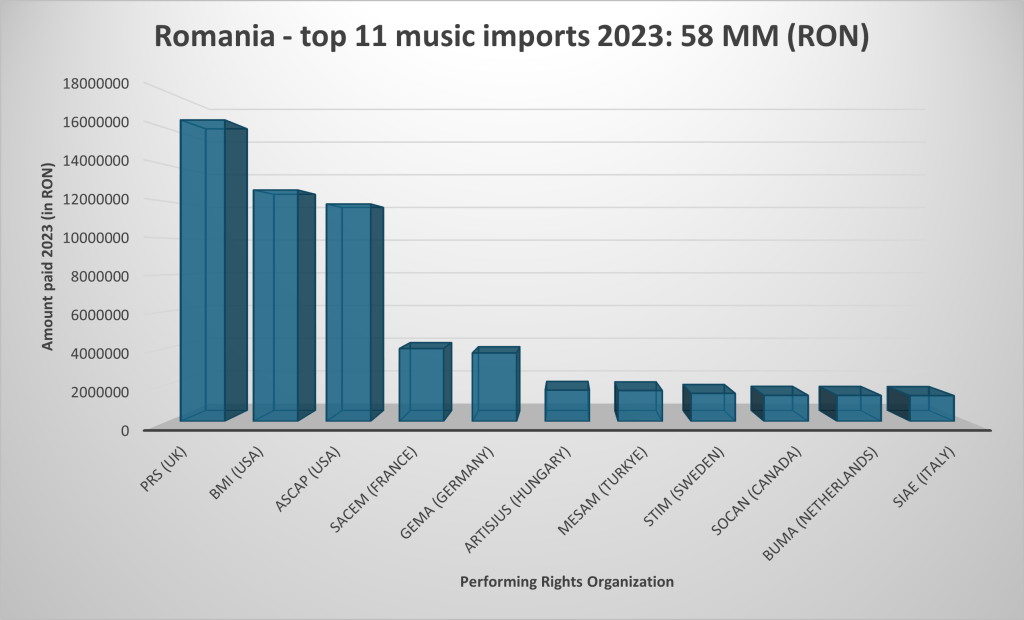 The latest yearly report from UCMR-ADA (as of 2023) provides insights into royalties collected abroad for Romanian artists (the export); and the payments made to foreign Performing Rights Organizations (PRO) for the use of international music in Romania (the import).