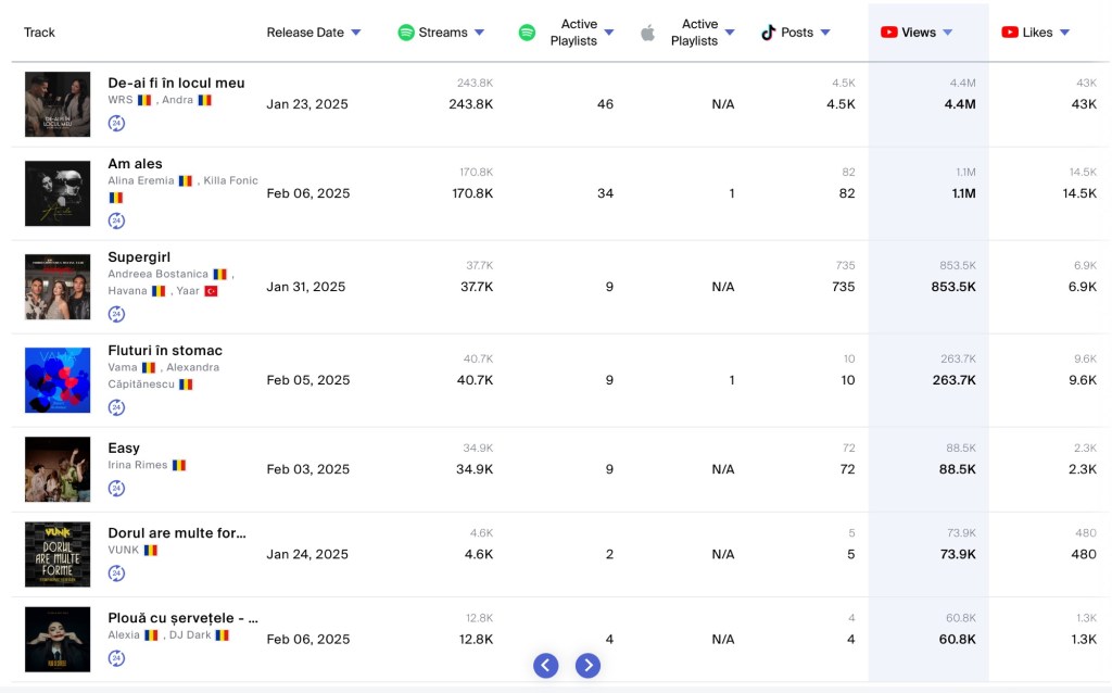 Meanwhile, a second Global Records production (beside Andra’s), featuring Alina Eremia and Killa Fonic claims the runner-up spot, being the only other track with over a million views on YouTube.