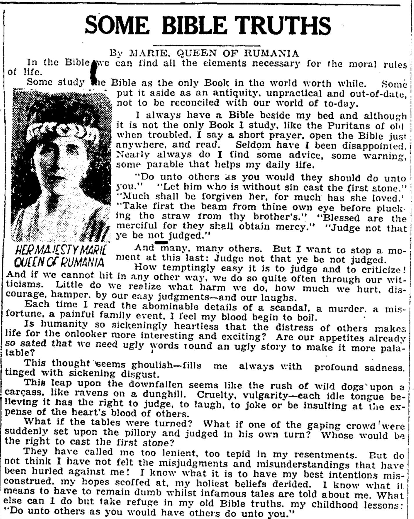 In this column, originally published on April 12, 1926, Queen Marie reflects on timeless Bible truths—offering a message about judgment, compassion, and human nature that still resonates today.