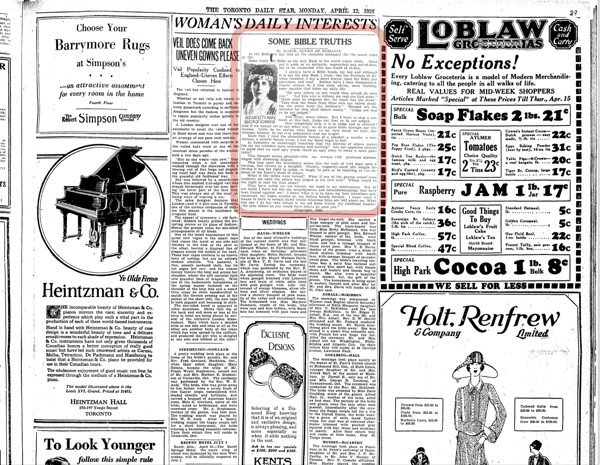 Although she had previously contributed a series of 16 syndicated articles to the Toronto Daily Star in 1925, her new column, launched in January 1926, carried a more personal distinction: it was proudly labeled “Written for The Toronto Star.”