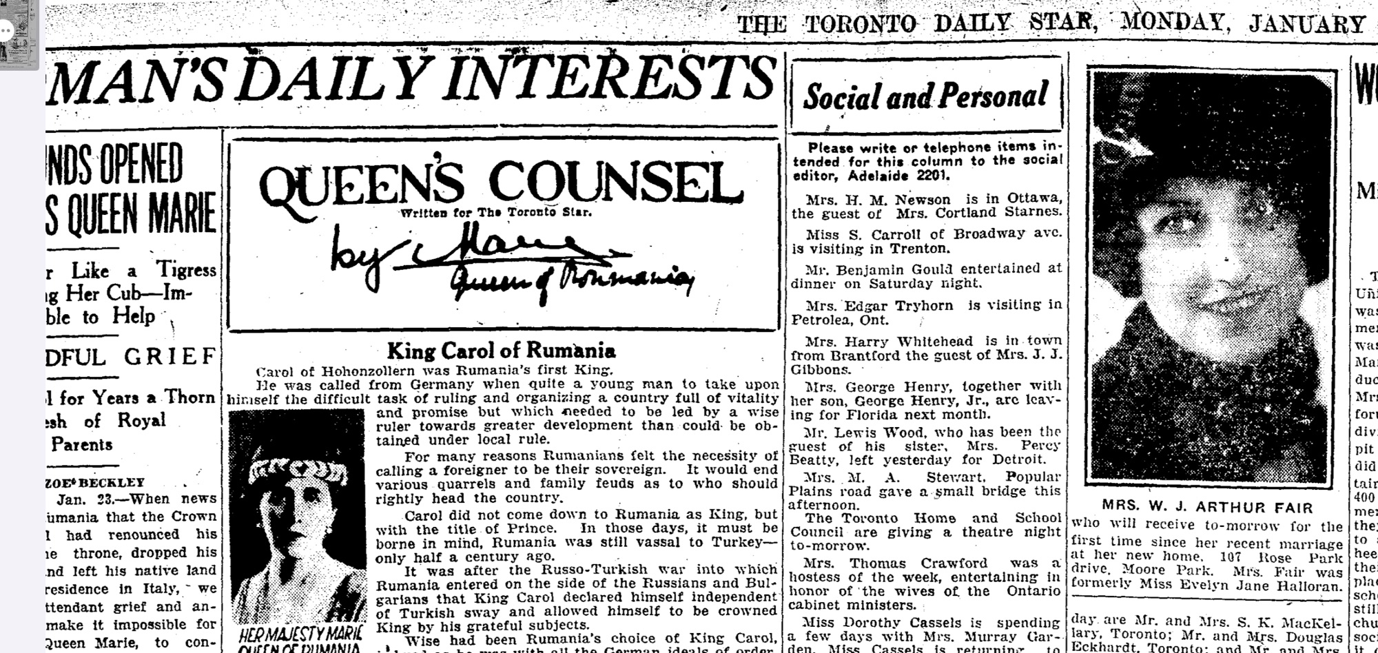 Few people realize that 100 years ago, Queen Marie of Romania—then 50 years old—was writing as a columnist for the Toronto Star.